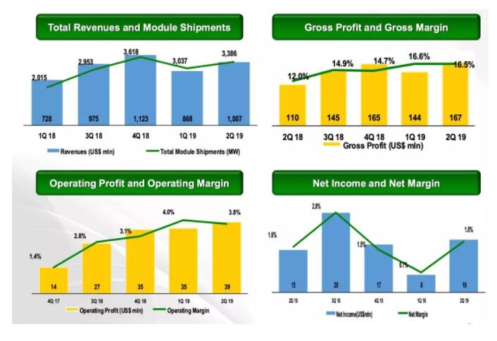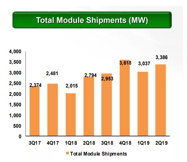 ◎ 太陽能組件總出貨量為3,386兆瓦,相比2019年第一季度的3,037兆瓦(包括集團內(nèi)部的出貨量)增長11.5%,相比2018年第二季度的2,794兆瓦增長21.2%。