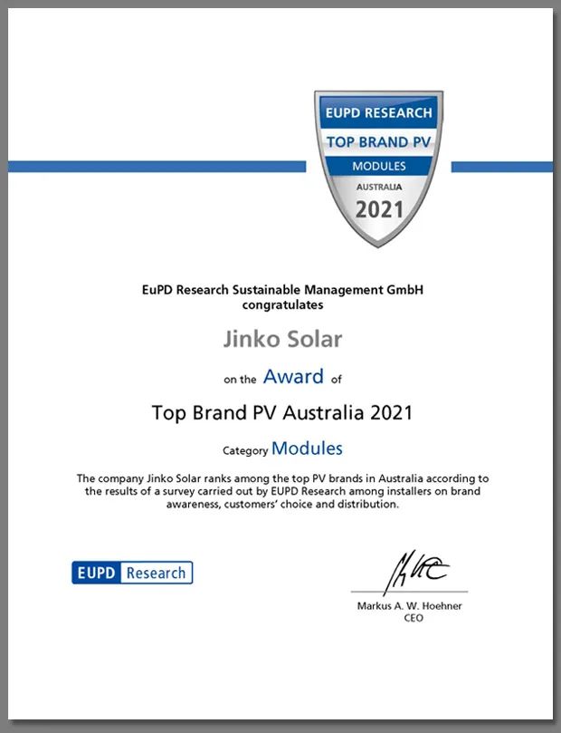 晶科能源榮獲由EuPD Research頒發(fā)的澳大利亞2021年度“頂級(jí)光伏品牌”獎(jiǎng)